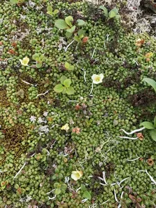 Diapensia obovata is a cushion-forming evergreen subshrub native to cold regions, characterized by its compact mound shape and small size.
