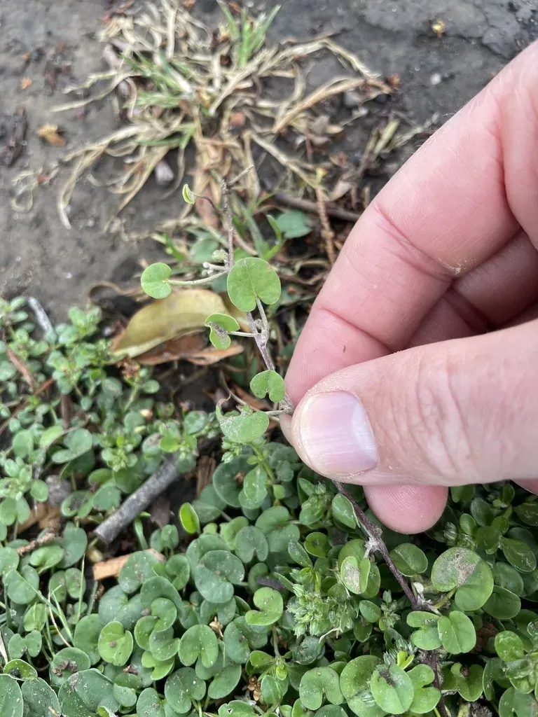 Dichondra micrantha is a perennial, prostrate herb with slender stems rooting at the nodes and small reniform to circular leaves.