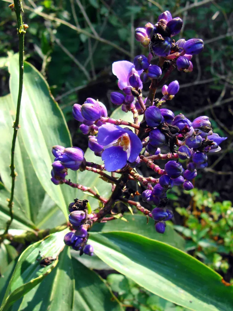 Dichorisandra thyrsiflora, commonly known as Blue Ginger, is a tropical perennial plant that resembles ginger in growth and habit but is botanically related to the spiderwort family.