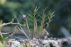 Dimerandra emarginata is an epiphytic orchid species native to tropical regions of Central and South America, known for its showy rose-colored flowers with a distinctive white patch on the lip.