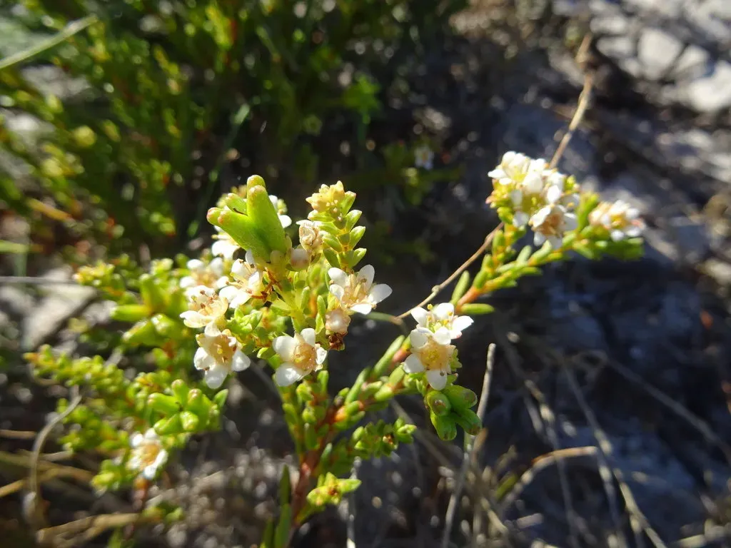 Diosma oppositifolia is an erect, multi-stemmed, densely leafy, aromatic shrublet up to 1 m high with small, needle-like to lance-shaped leaves arranged oppositely.