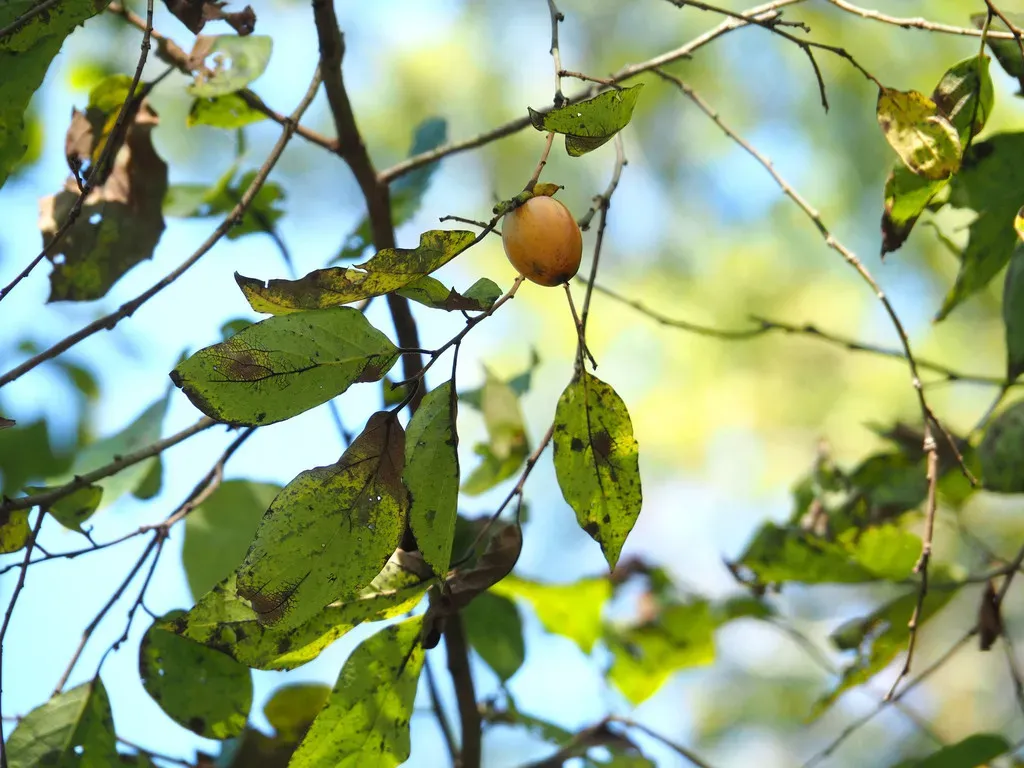 A medium-sized deciduous tree native to the eastern United States, known for its edible orange fruit and distinctive blocky bark.