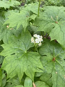 Diphylleia cymosa is a clump-forming perennial plant native to the Appalachian Mountains of the United States, known for its large, umbrella-like leaves.