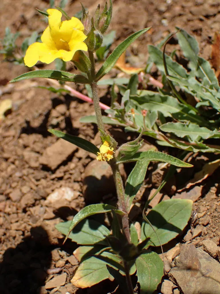 Diplacus brevipes is a hairy annual herb native and endemic to California, producing erect stems up to 80 cm tall with bright yellow flowers.