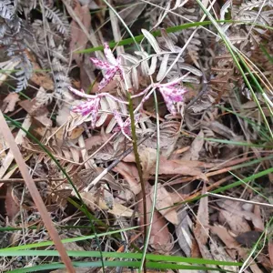 Slender Hyacinth-orchid (Dipodium Variegatum) is a perennial herb in the Orchidaceae family with moderate care difficulty. It requires moderate watering and partial shade or dappled_shade light in USDA hardiness zones 9-11. This plant is safe for cats and dogs.