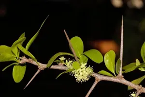 Dovyalis caffra is a spiny, evergreen shrub or small tree known for its edible yellow fruit and dense, thorny branches.