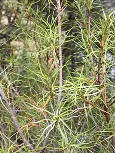 An upright, grassy-leaved shrub or small tree endemic to New Zealand, known for its long, narrow, pointed leaves and erect habit.