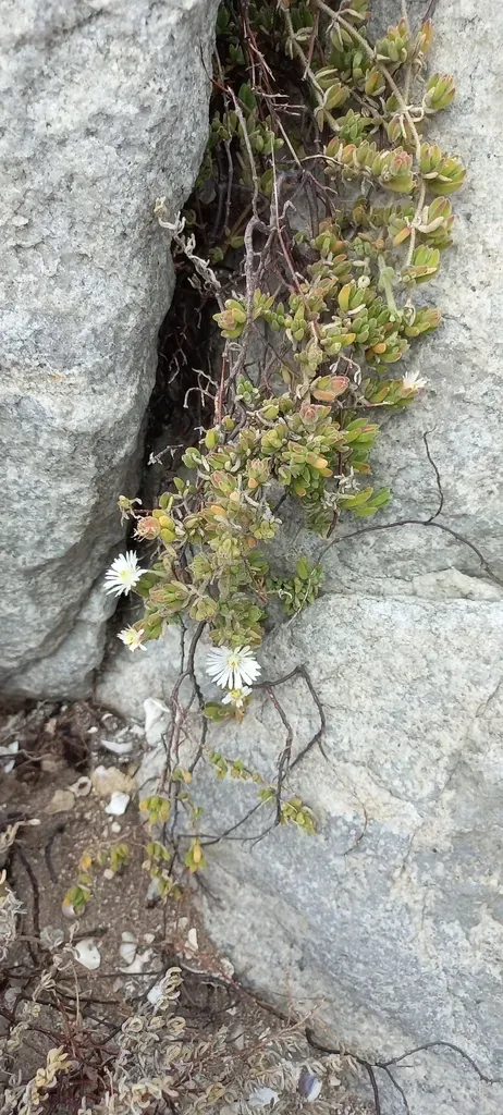 Drosanthemum candens is a low-growing, mat-forming succulent plant with cylindrical, grey-green leaves and pale pink or white flowers that open at midday.