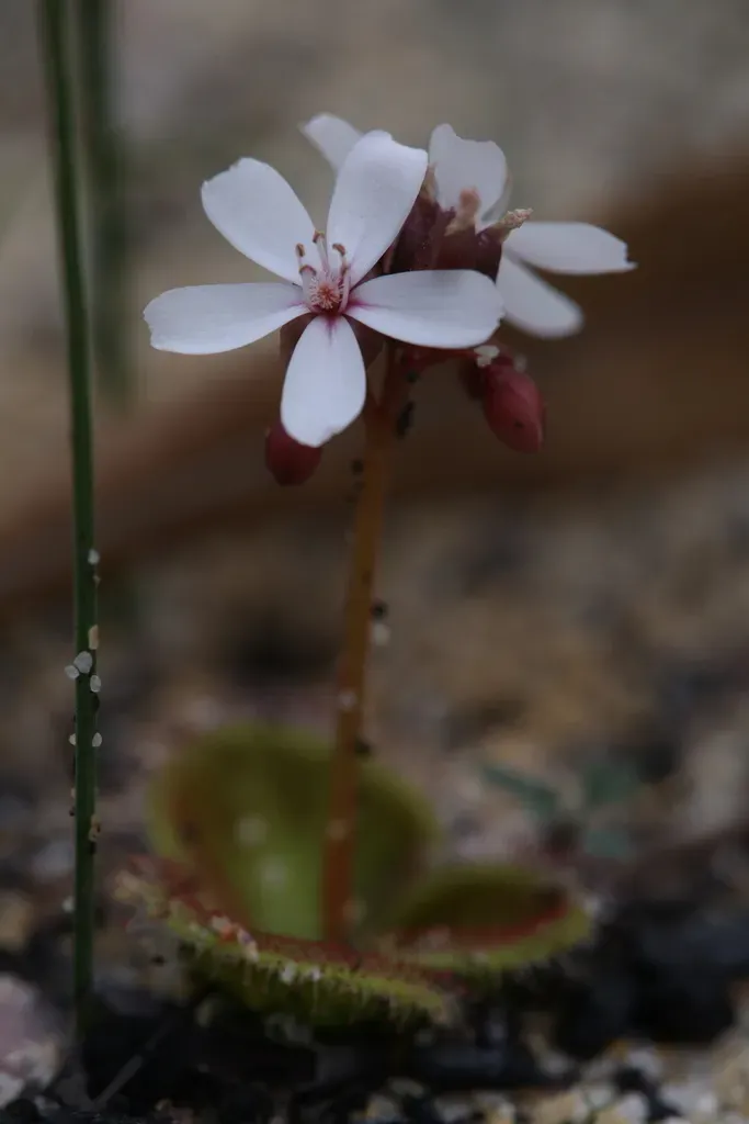 Drosera erythrorhiza is a tuberous, carnivorous sundew species native to southwestern Australia, known for its rosetted leaves and red coloration.