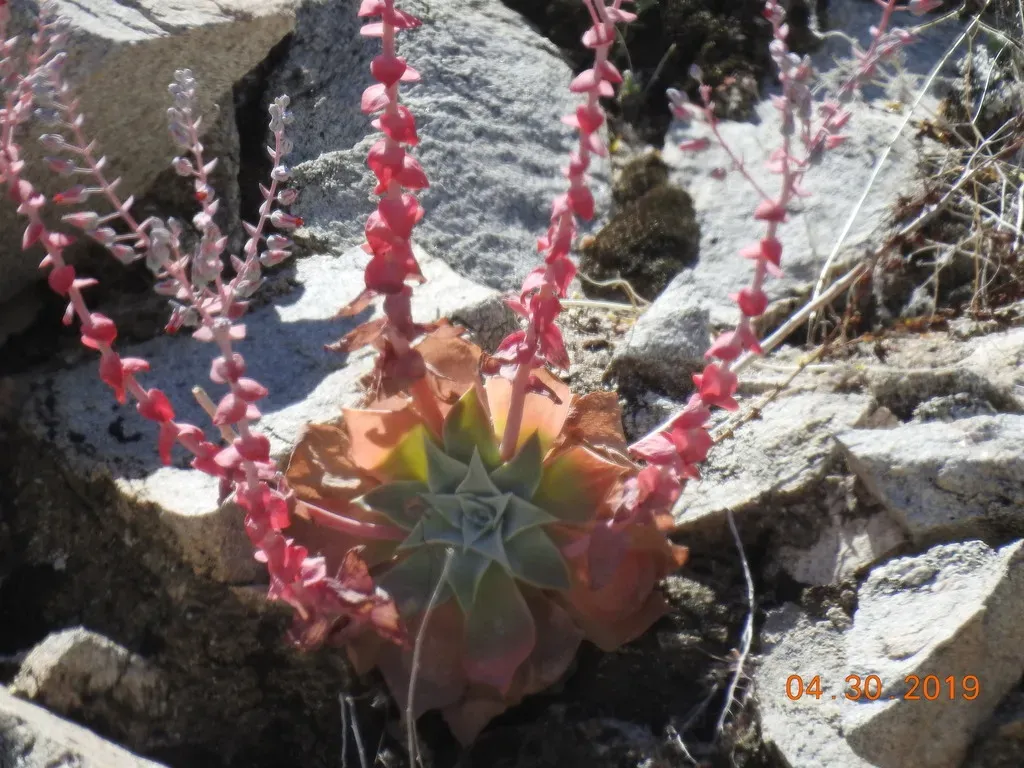 Dudleya arizonica is a perennial succulent herb known for its rosette of fleshy leaves and striking red flowers.