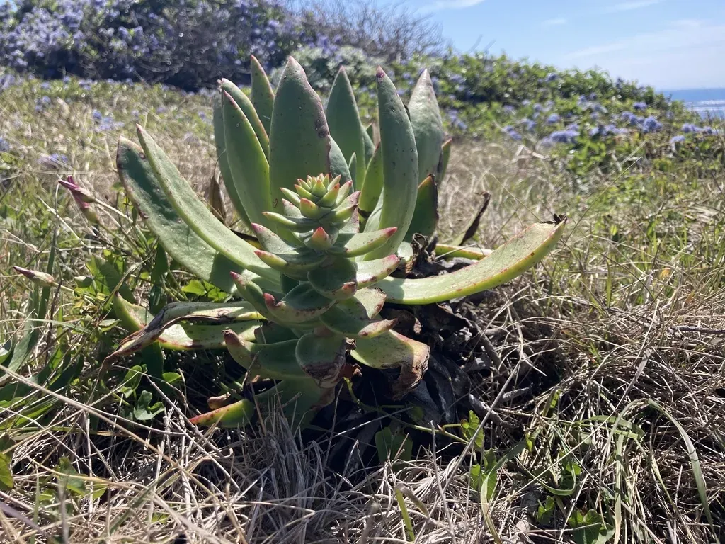Dudleya palmeri is a succulent plant endemic to the California coastline, known for its rosette of lance-shaped leaves and vibrant flowers.