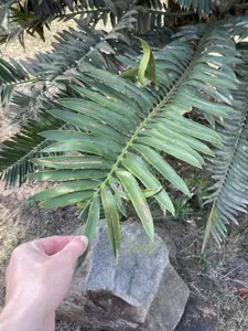Encephalartos natalensis is a large, evergreen cycad native to the northern parts of the Eastern Cape, South Africa, known for its tall trunk and large green leaves.