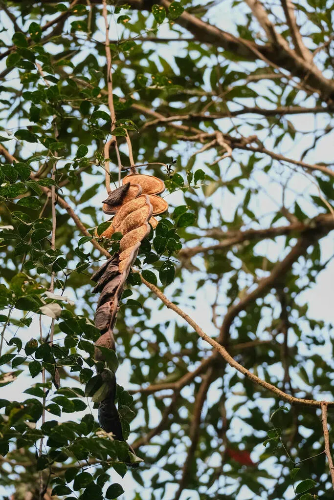 Entada rheedei is a large woody liana or climber known for its vigorous growth and large seed pods.