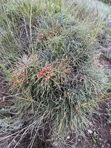 Ephedra monosperma is a small, perennial shrub native to Asia, known for its jointed, woody stems and red berries.