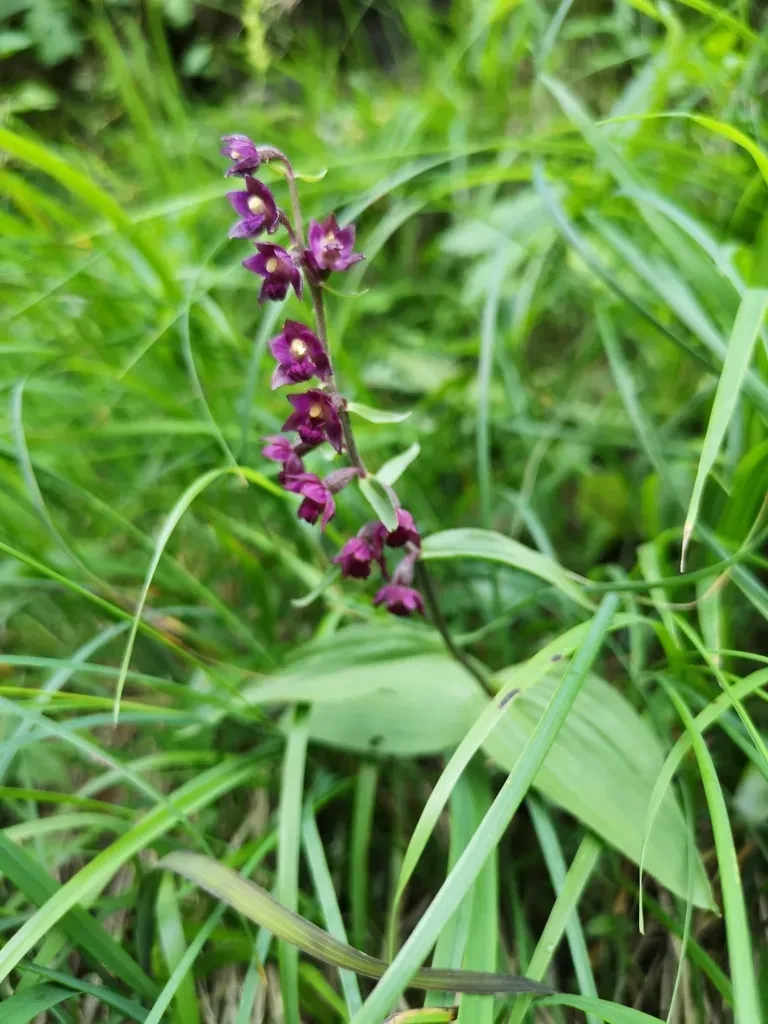 Epipactis atrorubens is a herbaceous perennial orchid known for its distinctive dark wine-red flowers and two-ranked leaves.
