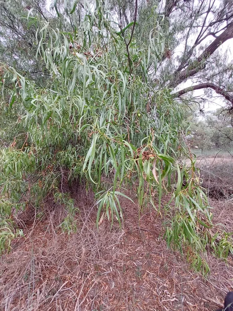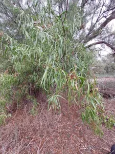 A spreading, weeping shrub or small tree with long, strap-like leaves and bell-shaped flowers.