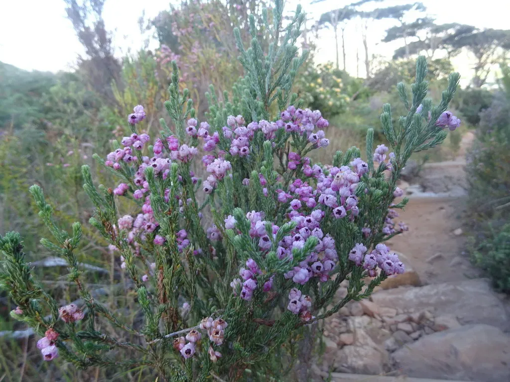 Erica baccans is a showy, evergreen shrub known for its profuse pink to cherry-red flowers and is endemic to the Cape Peninsula in South Africa.
