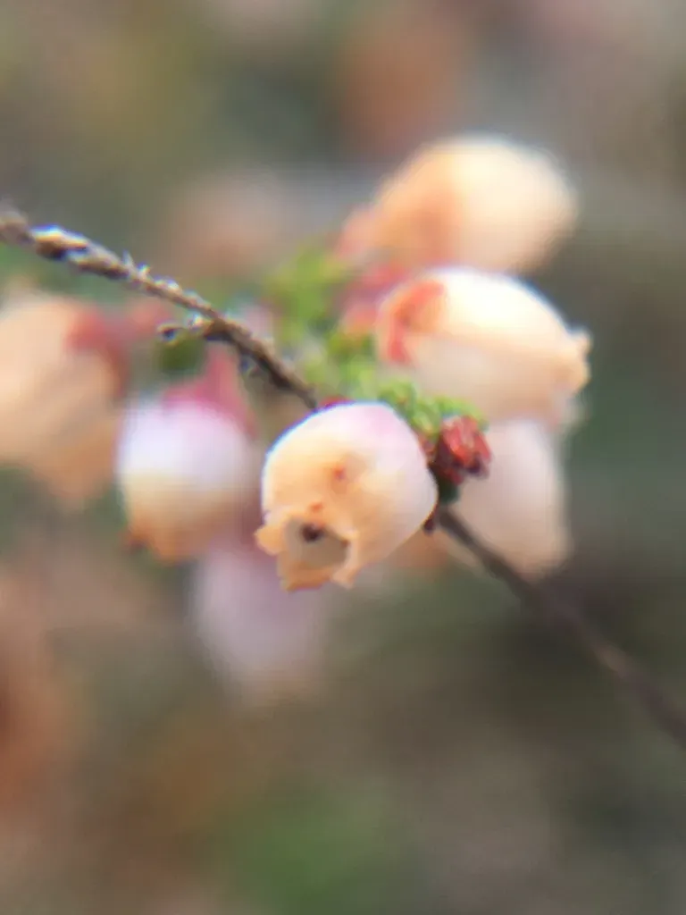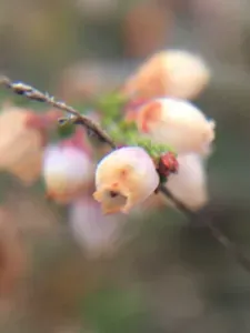 A compact, evergreen shrub reaching about 50cm tall with tiny linear dark green leaves and bell-shaped mid-pink flowers blooming from autumn to spring.