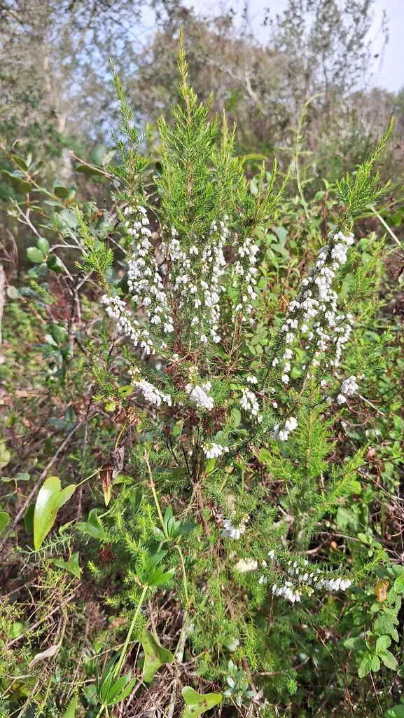 Erica lusitanica is an evergreen shrub native to southwest Europe, known for its plume-like branches and tubular white flowers with pink-tinged buds.