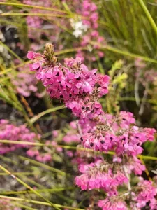 Erica melanthera is a compact, bushy evergreen shrub with needle-like foliage and bell-shaped flowers, typically growing up to 1 meter tall.