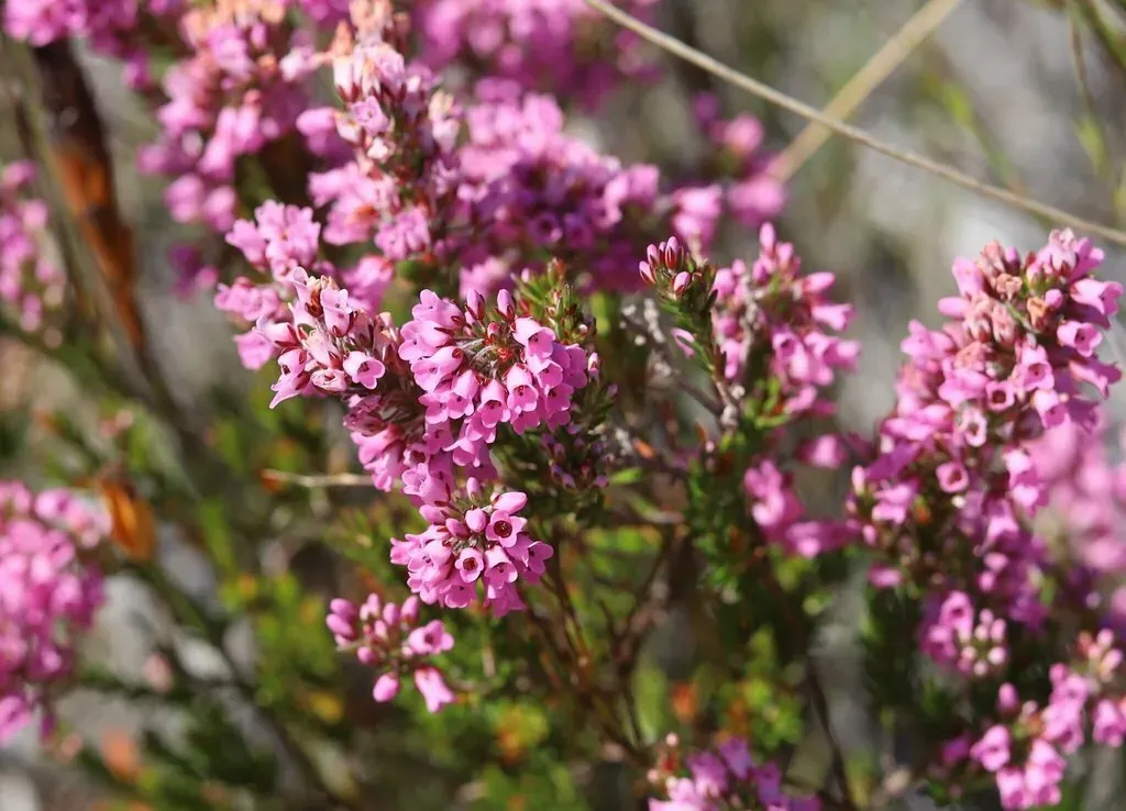 Erica pulchella is a compact, evergreen shrub known for its attractive, small bell-shaped flowers and fine-textured foliage.