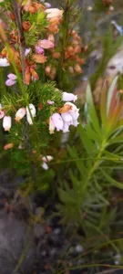 Erica sitiens is an evergreen shrub native to the Cape Province, known for its needle-like leaves and clusters of small flowers adapted to arid, sandy environments.