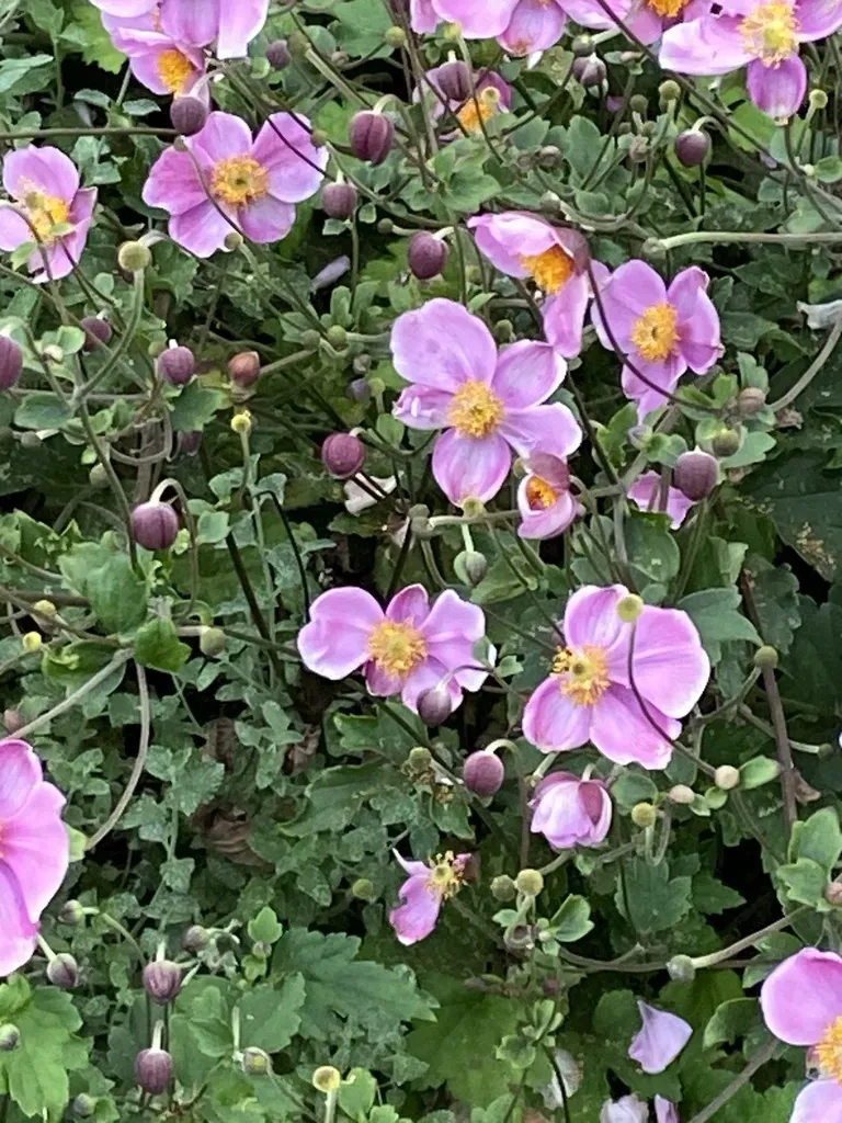 Eriocapitella hupehensis is a herbaceous perennial plant known for its late summer to fall blooming, with pink to mauve saucer-shaped flowers and divided dark green leaves.