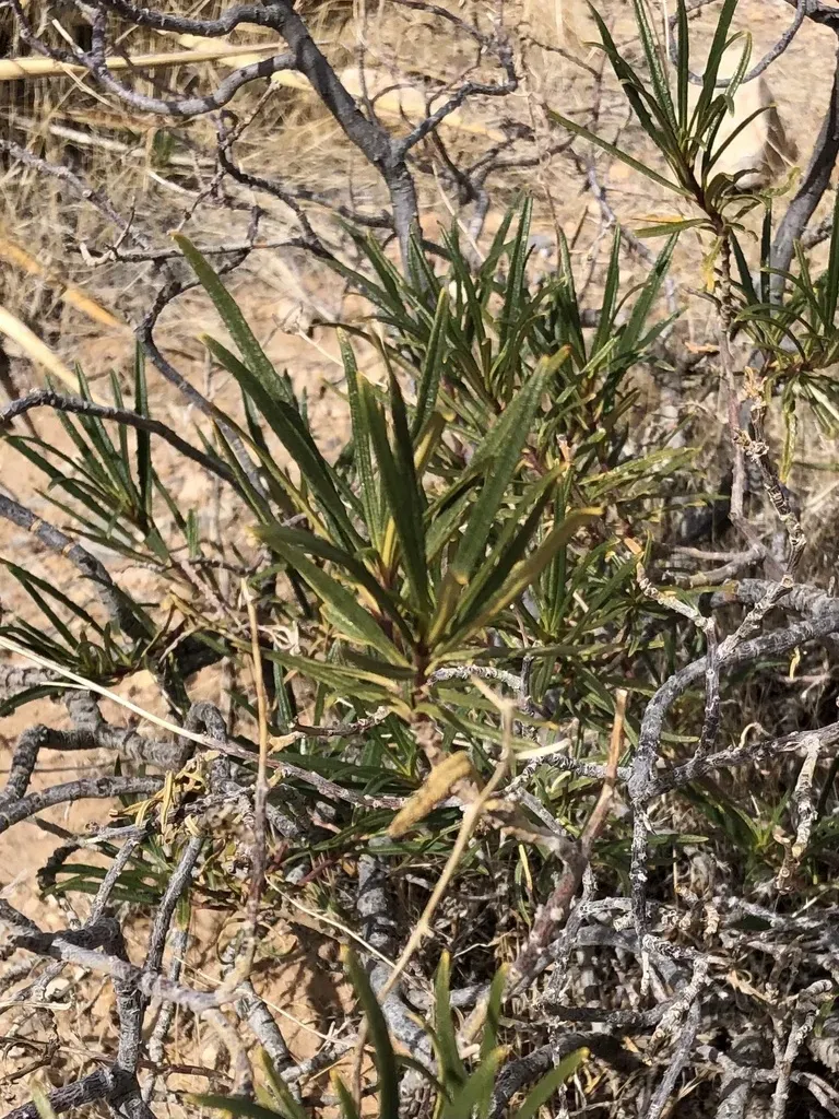 Eriodictyon angustifolium is a perennial evergreen shrub native to the deserts and woodlands of western North America, known for its aromatic leaves and narrow foliage.