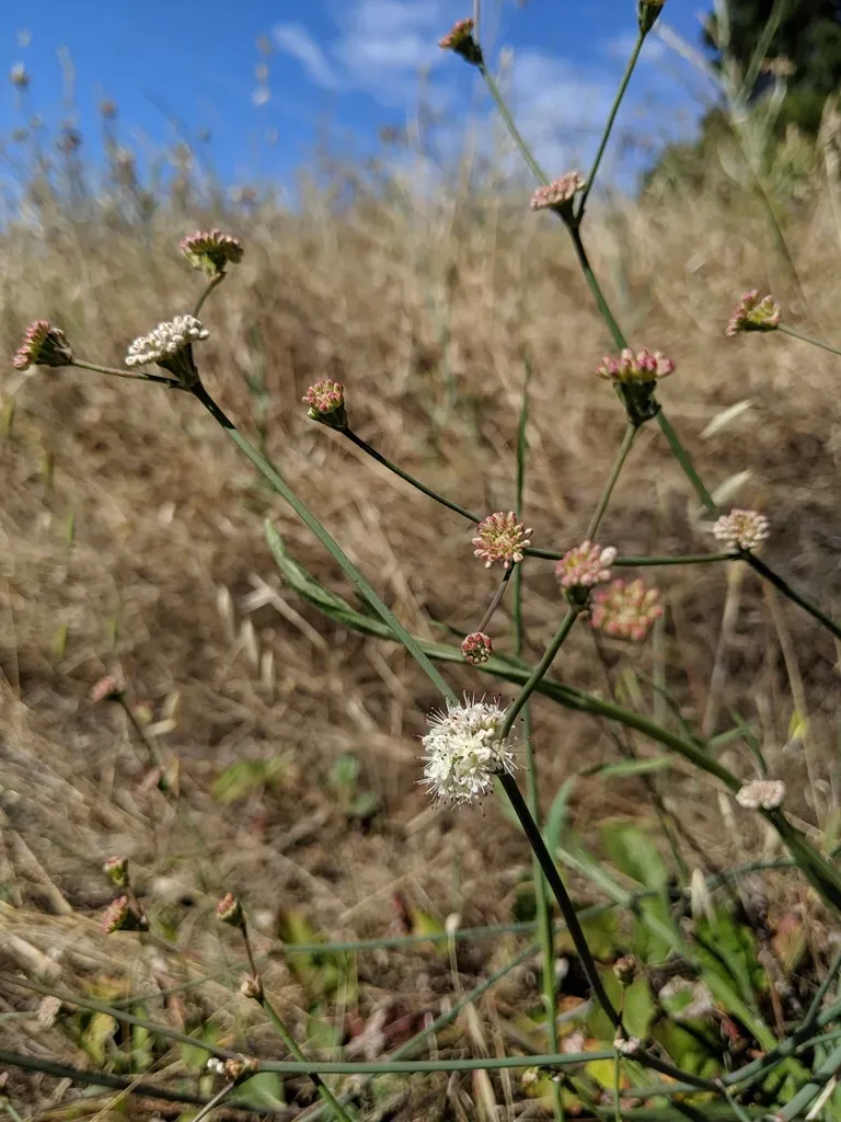 Eriogonum nudum is a perennial shrub known for its tall, bare, leafless stems topped with clusters of small white or pale pink flowers.