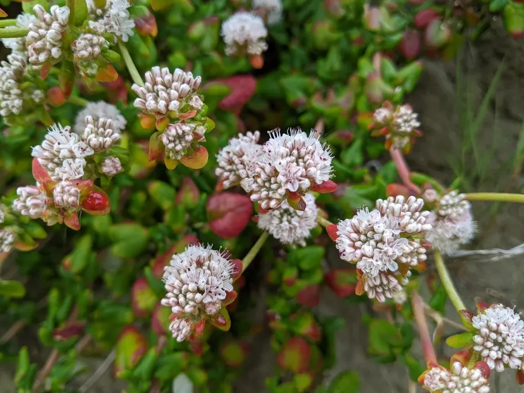 Eriogonum parvifolium, known as Sea Cliff Buckwheat, is a low-growing shrub native to coastal California, characterized by mounded growth and clusters of pink flowers.