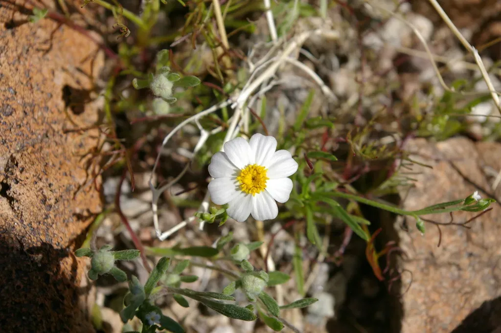 Eriophyllum lanosum is a small, whitish-woolly annual plant that may grow erect or lie along the ground with stems curving upward. It is native to desert regions and blooms in spring.