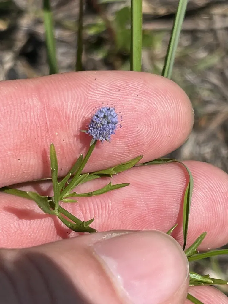 Eryngium baldwinii is a biennial aromatic herbaceous groundcover native to the southeastern United States, known for its low growing, creeping habit and blue flowers.