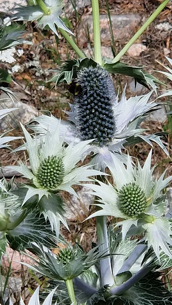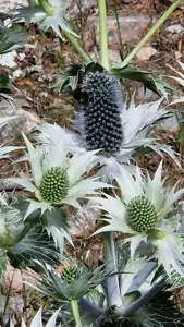 Eryngium giganteum is a large, thistle-like biennial or short-lived perennial known for its striking, silvery-blue flower heads and spiny, architectural foliage.
