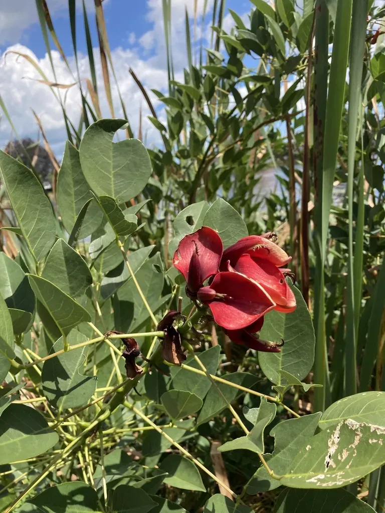 Erythrina crista-galli is a deciduous, spiny small tree known for its striking coral-red flowers and corky bark.