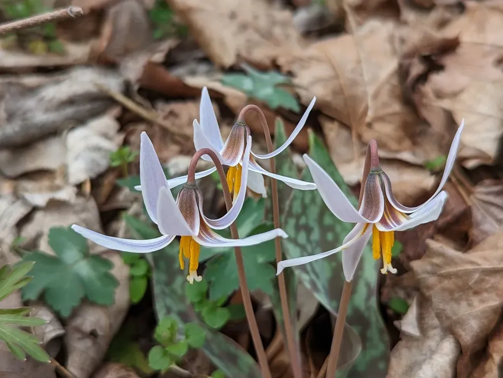 Erythronium albidum is a small herbaceous perennial wildflower native to eastern North America, known for its nodding white bell-shaped flowers with backward-bent petals and mottled green leaves.