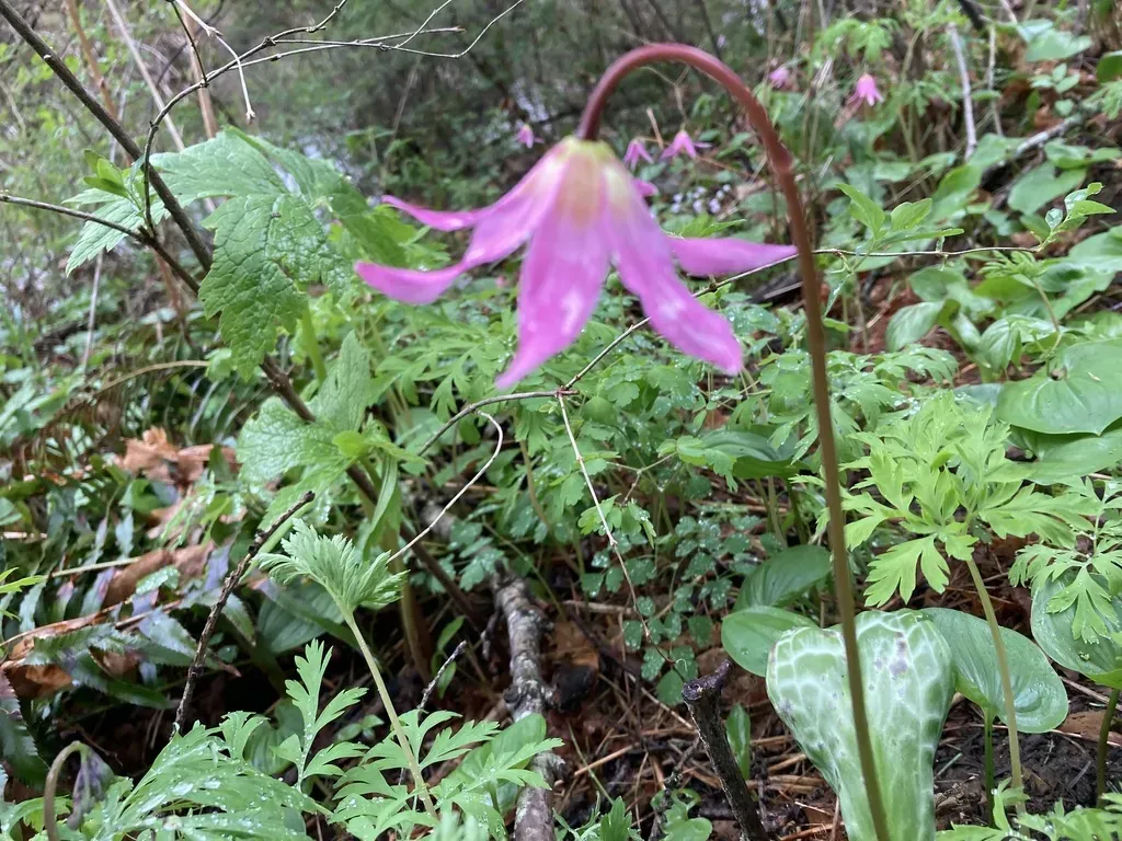 Erythronium revolutum is a perennial bulbous herb native to the Pacific Northwest, known for its nodding, pink to maroon flowers and mottled leaves.