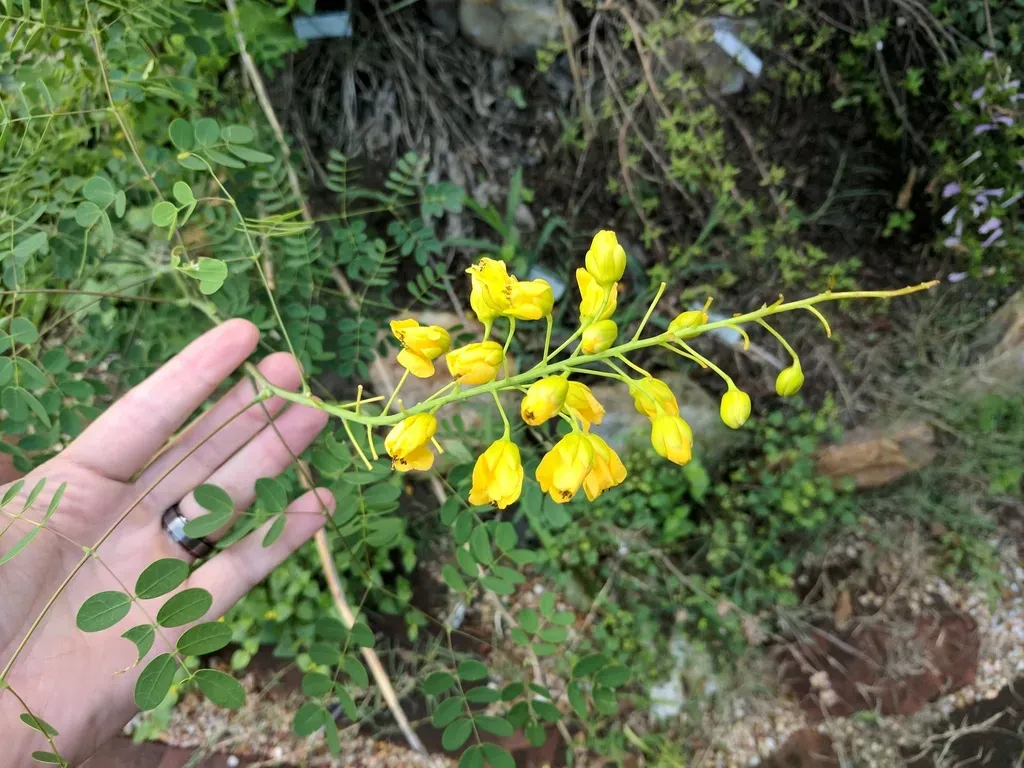 Large, evergreen shrub or small tree with yellow flowers and legume seed pods.
