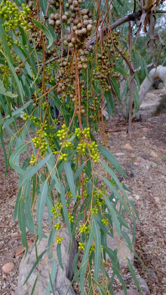 A large, fast-growing evergreen tree native to Australia, widely recognized for its smooth bark and lance-shaped leaves.