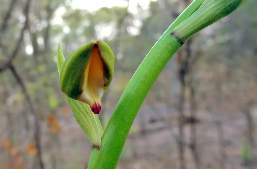 Eulophia streptopetala is a terrestrial orchid species characterized by robust flowering stems and distinctive yellow-green flowers with purple markings.