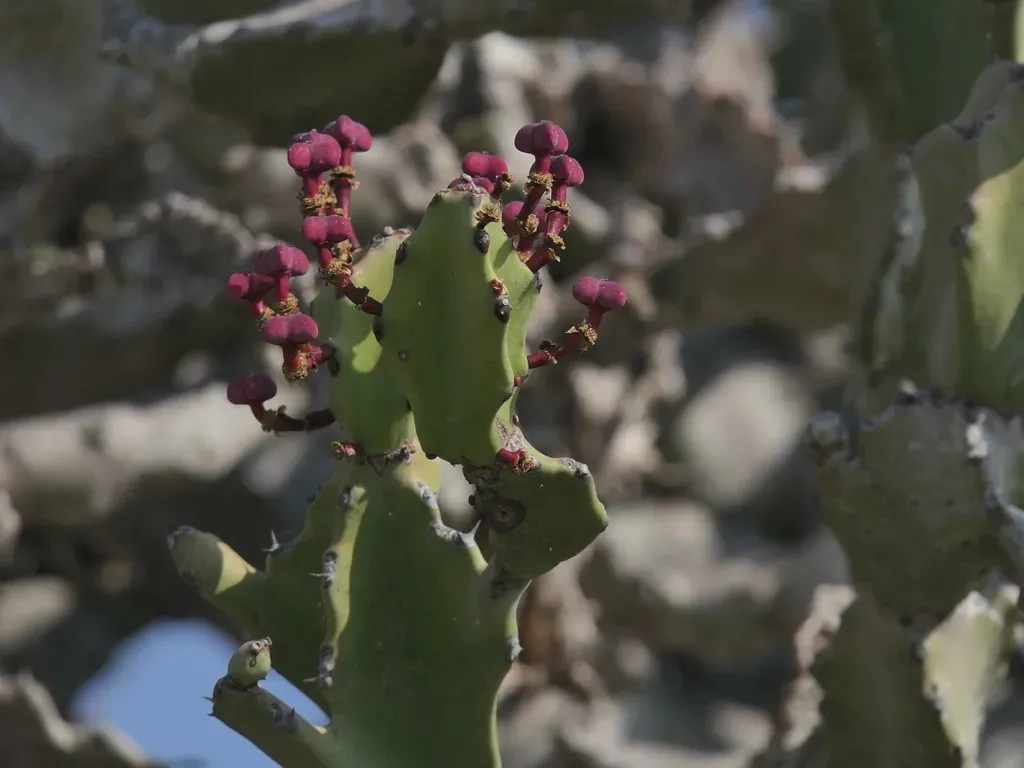 A spiny, succulent shrub or small tree native to India and Southeast Asia, known for its columnar, segmented green stems and minimal leaves.