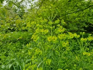 Euphorbia esula is a perennial wildflower known for its prolific growth and invasive nature, often forming thick clumps.