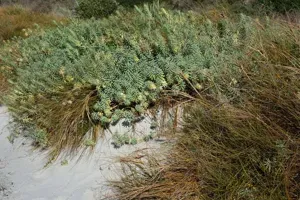 Euphorbia glauca is a perennial coastal herb native to New Zealand, characterized by its blue-green foliage and reddish stems.