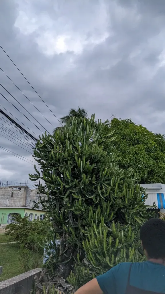 Euphorbia lactea is a succulent, cactus-like shrub or small tree with spiny, mottled green and white stems, native to subtropical and arid regions of South Asia.