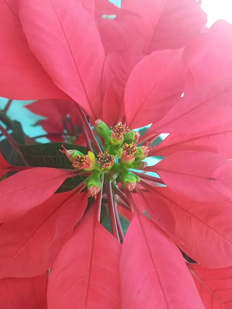 Euphorbia pulcherrima, commonly known as poinsettia, is a deciduous to semi-evergreen shrub or small tree native to Mexico and Guatemala, prized for its bright red and green foliage, especially popular during the Christmas season.