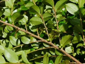Eurya (Eurya Crenatifolia) is a perennial shrub in the Pentaphylacaceae family with easy care difficulty. It requires moderate watering and partial shade or full shade light in USDA hardiness zones 8-10. This plant is safe for cats and dogs.