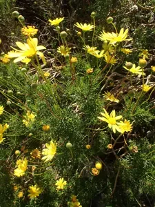 Euryops abrotanifolius is a hardy fynbos shrub known for its bright yellow daisy-like flowers that bloom in winter and spring.