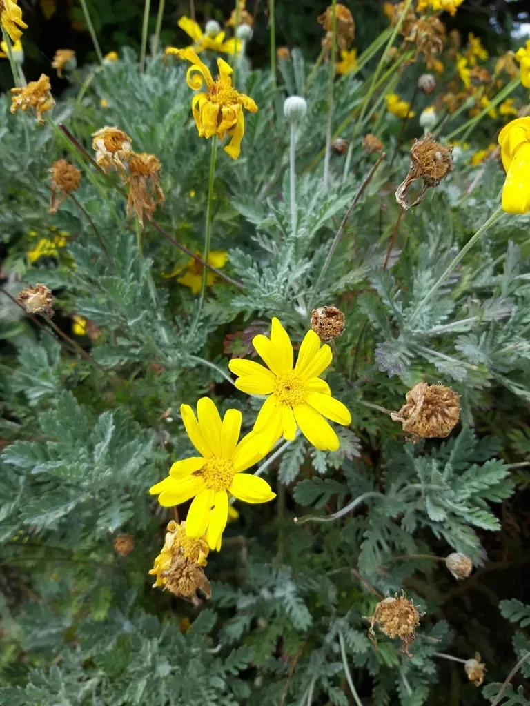 Euryops pectinatus is a compact, perennial, evergreen shrub native to the rocky slopes of the South African Cape, known for its bright yellow daisy-like flowers and finely divided grey-green leaves.