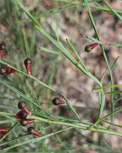 Exocarpos strictus is an erect shrub native to Australia, known for its cherry-like fruit and dense thickets formation.