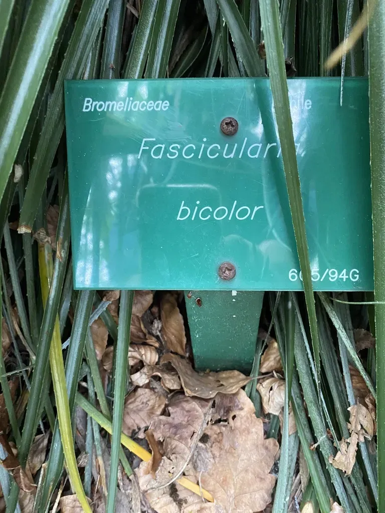 Fascicularia bicolor is a terrestrial bromeliad known for its rosette-forming habit and striking foliage that turns bright red during blooming.