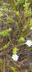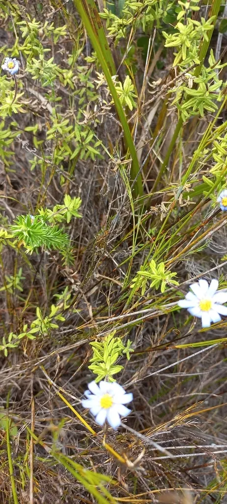 Felicia fruticosa is a strongly branching, evergreen shrub native to South Africa, known for its blue to purple daisy-like flowers and leathery leaves.